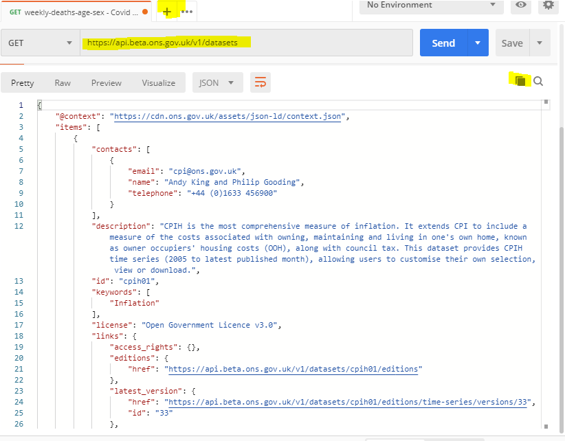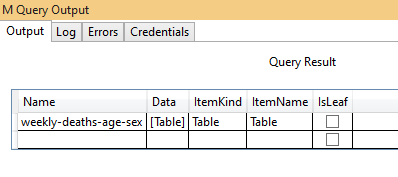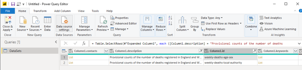 For more of the detail read on The data in the API is provided in JSON format and requesting using HTTP GET requests.I was unfamiliar with JSON & GET requests and found the best way I found to quickly send GET requests was to use postman (www.postman.com). An example if you want to see get all the available datasets the ONS has on this site send the following GET request: https://api.beta.ons.gov.uk/v1/datasets.  To do that in Postman just copy and paste the above text into the app and press send. The response you receive back is the data in JSON format.  It’s a little tricky to read so I found it easier to copy and paste it into a text file and save it with the .json file extension.  You can then open it in Power BI.  Below I’ve selected the two datasets (weekly-deaths-age-sex and weekly-deaths-local-authority). Each dataset has several dimensions and allowed options, think of them as filters and filter values (i.e. time = 2020 and sex = male). For each request all dimensions must be used with valid options.  There is a wildcard option however this is only allowed to be used on one dimension per request. This means you cannot send one request to get all the data from a dataset.  However, you can send many requests to get around this and we’ll get to that in a bit. My connector uses the weekly-deaths-age-sex dataset. To get a list of all required dimensions run this command in postman: https://api.beta.ons.gov.uk/v1/datasets/weekly-deaths-age-sex/editions/covid-19/versions/4/dimensions For each dimension run this command to get a list of valid options: https://api.beta.ons.gov.uk/v1/datasets/weekly-deaths-age-sex/editions/covid-19/versions/4/dimensions/agegroups/options I’m using the following options: